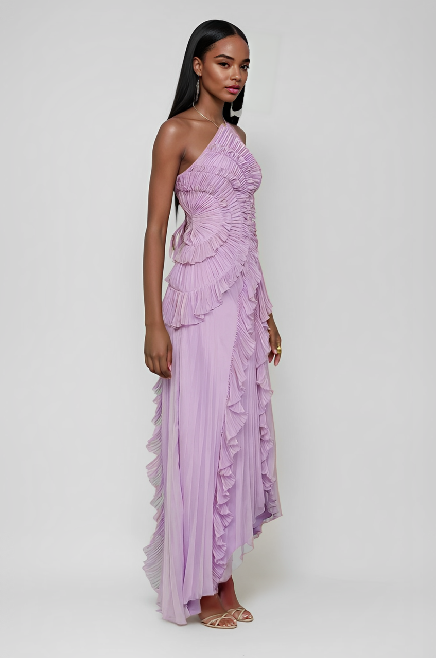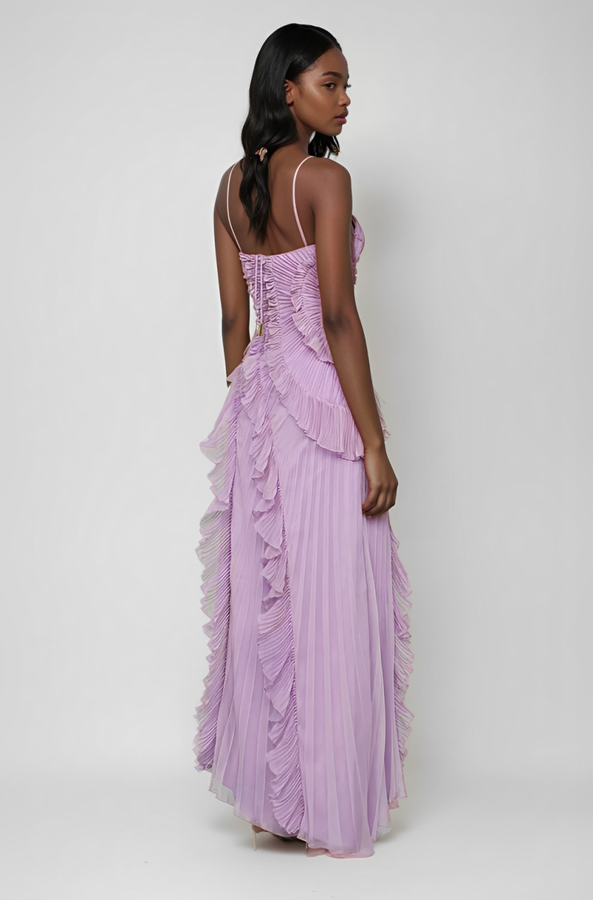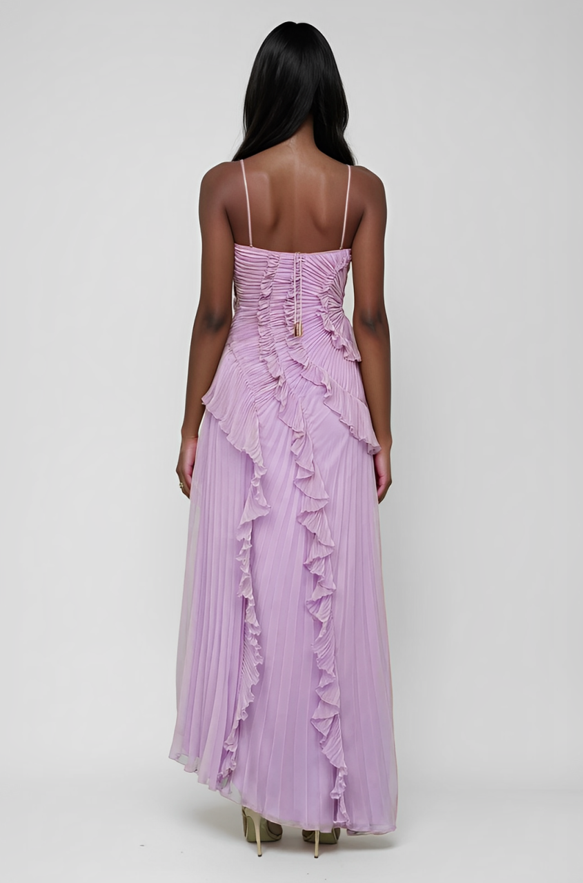 Crafted with premium polyester, with an ode to movement and form. Lily pad-inspired pleating swirls across the bodice, cascading into soft ruffles that mimic water currents.