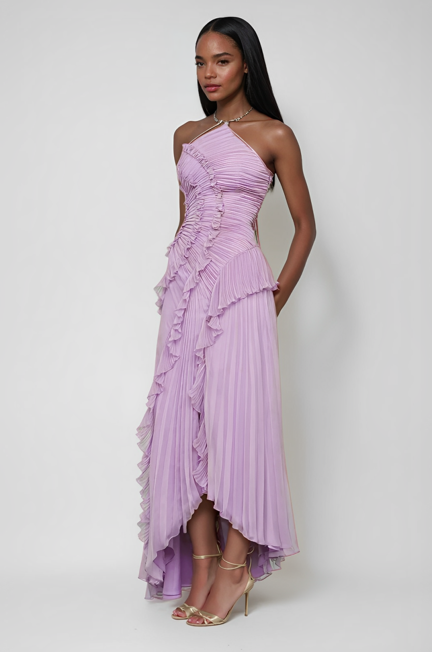 'Lotus' embodies sculptural grace—pleated layers cascading like petals in motion. From intimate soirées to grand entrances, this halter dress is designed to enchant at every turn.