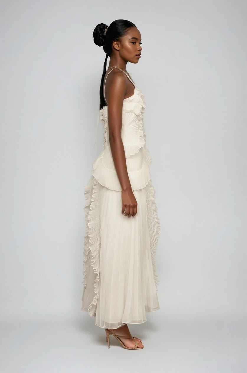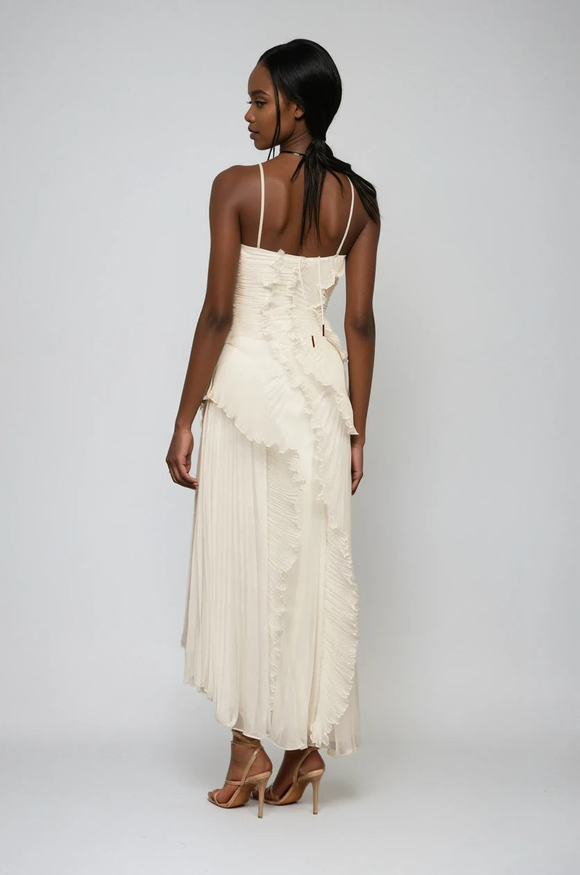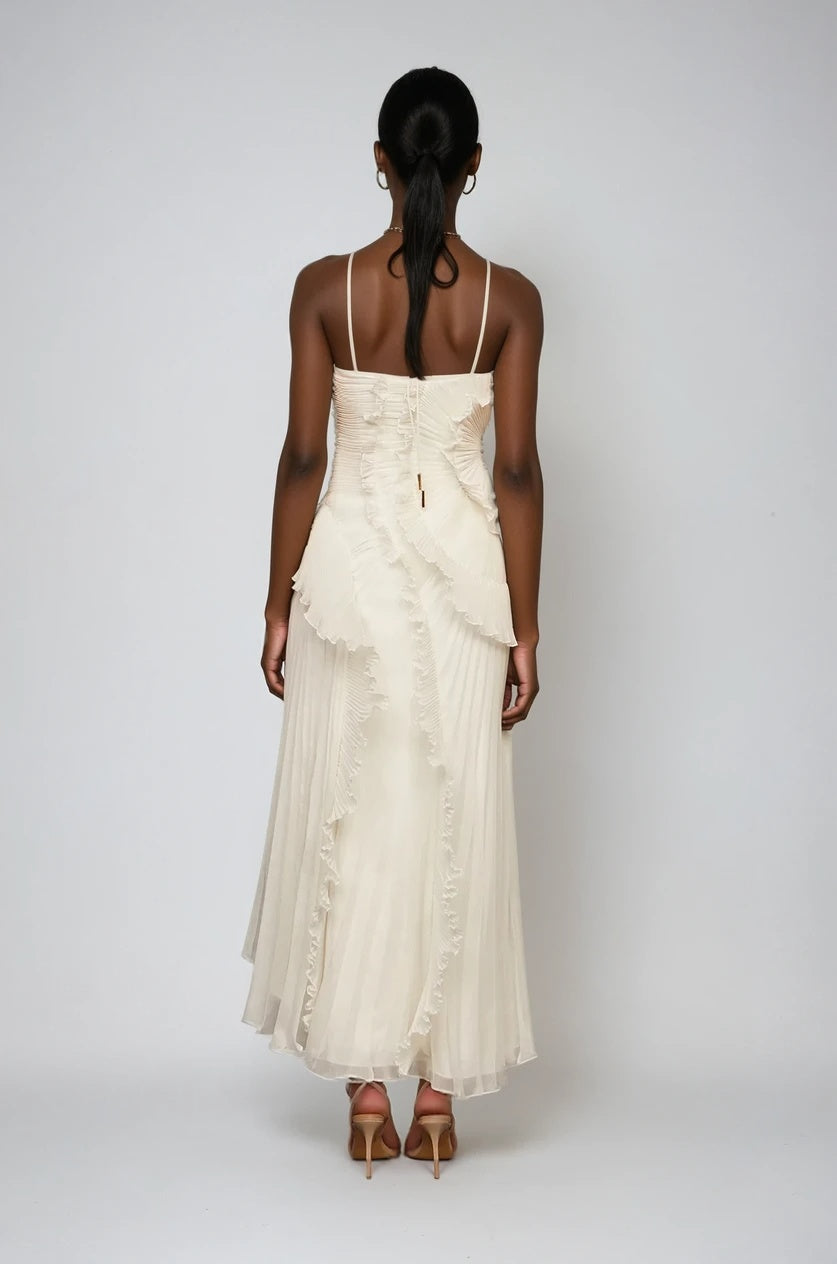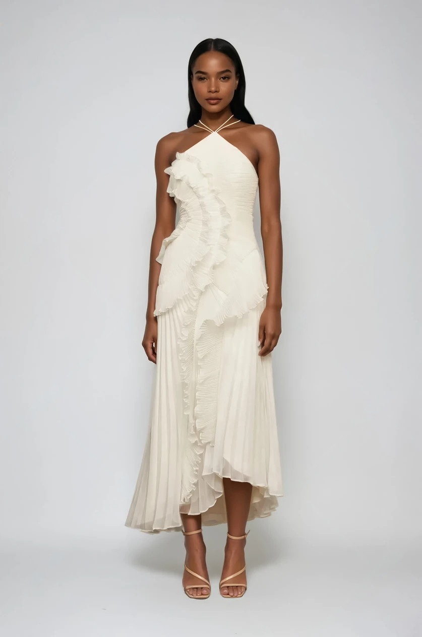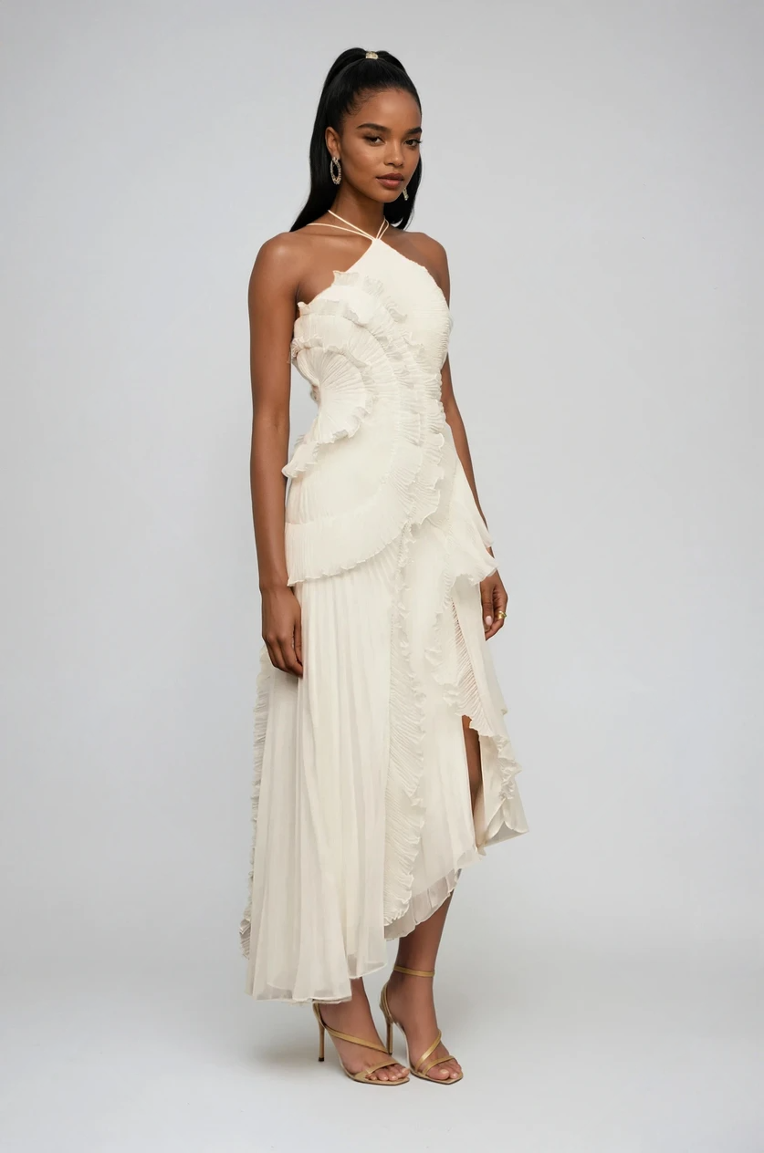 'Lotus' embodies sculptural grace—pleated layers cascading like petals in motion. From intimate soirées to grand entrances, this halter dress is designed to enchant at every turn.